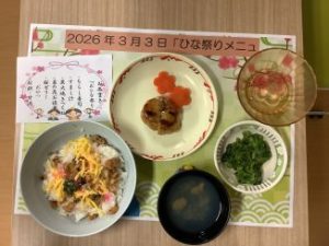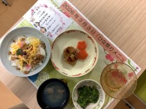 この日のメニューは、ちらし寿司に鶏つくねと菜の花のお浸し。